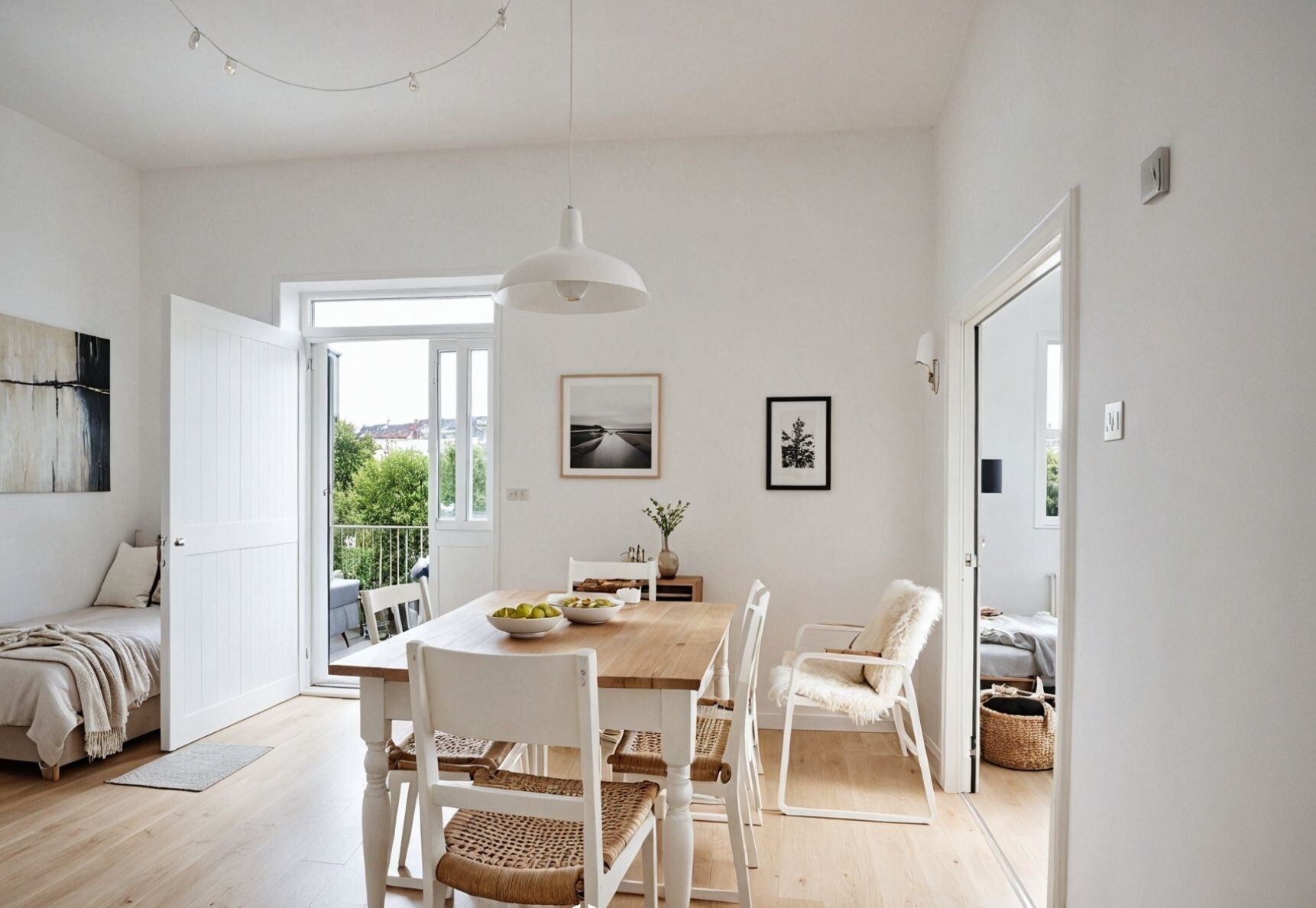 Accediamo alla proprietà dal cancello carrabile verso il giardino che offre una parte pavimentata e una parte verde arricchita da piante e alberi, al centro svetta la casa bianca di cui raggiungiamo l'ingresso con pochi scalini. L'abitazione ha grandi spazi interni ed è composta da sala da pranzo con cucinotto separato, un salone con terrazzo che affaccia verso il giardino d'ingresso e un bagno spazioso a servizio della zona giorno.
