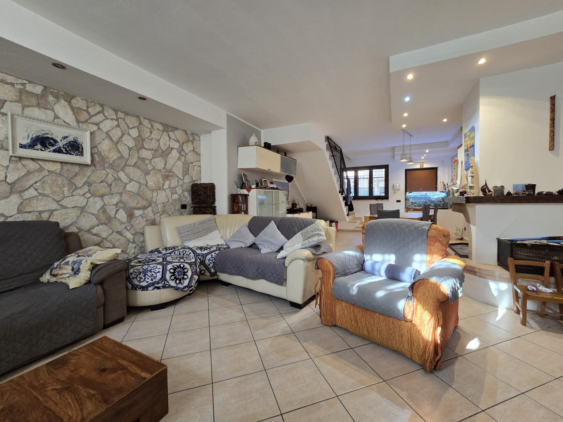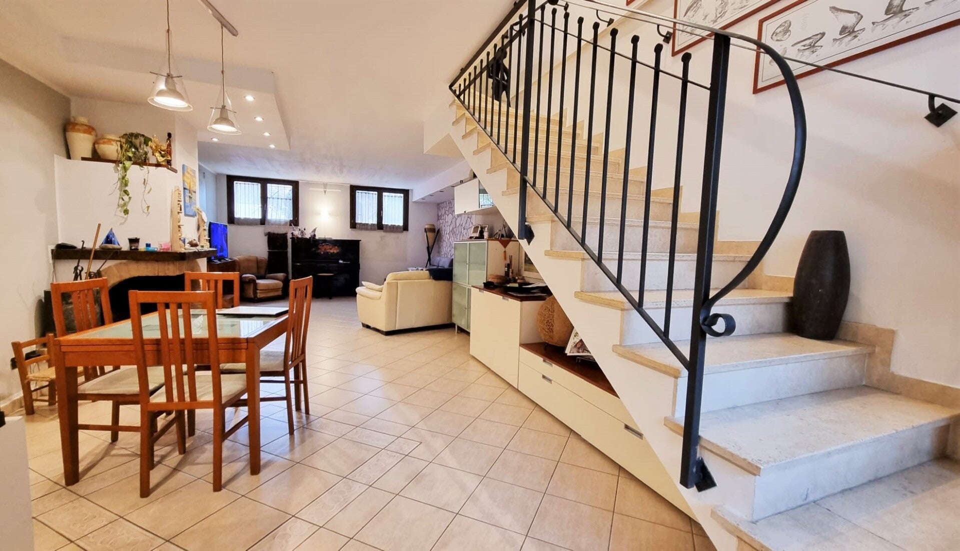 Si accede all'abitazione dal cortile pavimentato vero il portoncino di ingresso, entriamo nella zona giorno, composta da un grande salone dalla pianta rettangolare con ampia zona living e zona pranzo, arricchito da camino in muratura, una parete rivestita in pietra e un moderno controsoffitto con faretti led incastonati. La cucina è abitabile e separata dal salone. Allo stesso livello troviamo anche un pratico bagno.