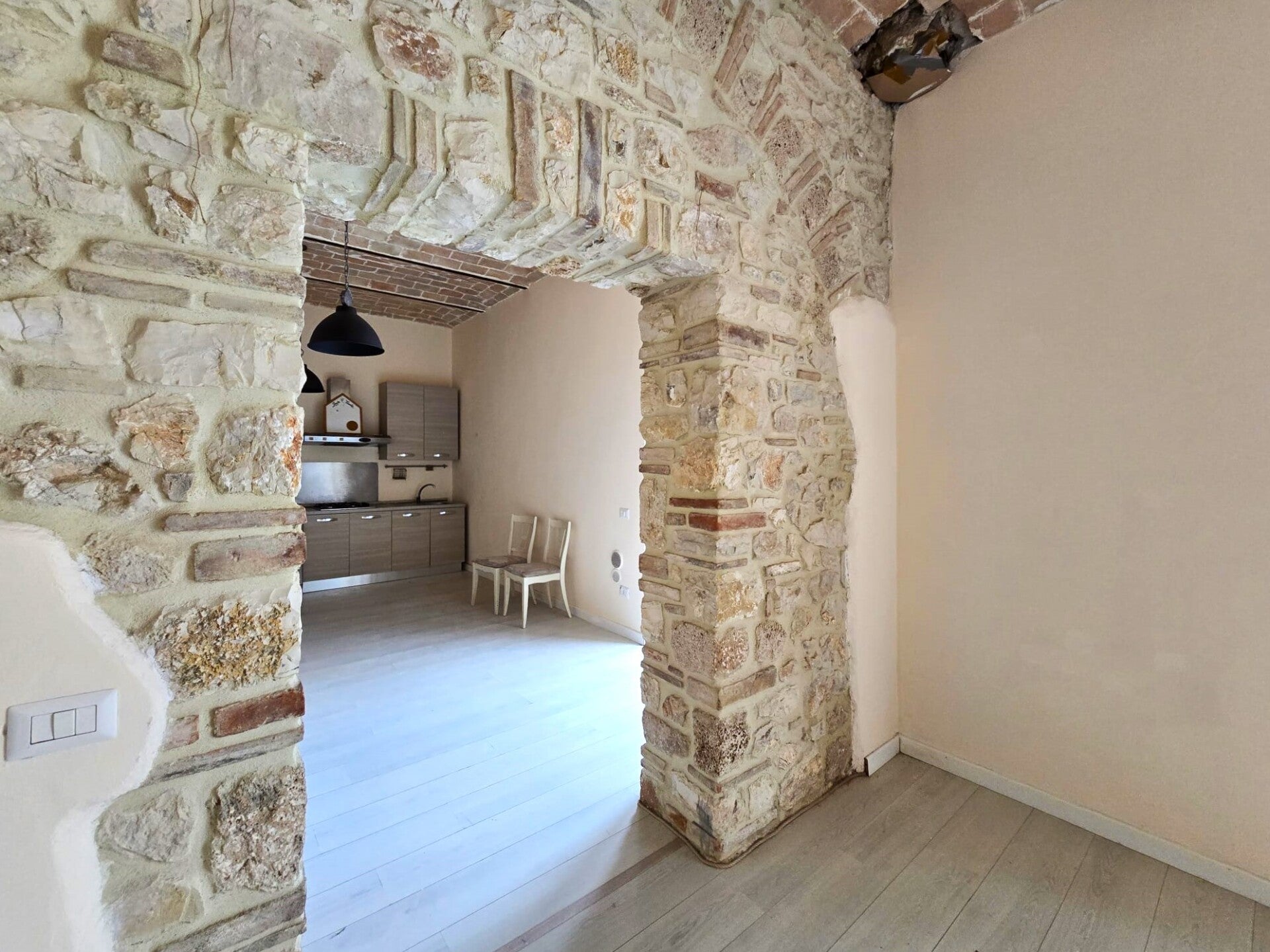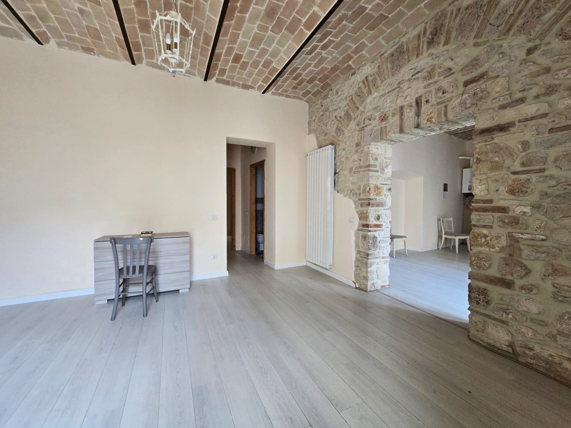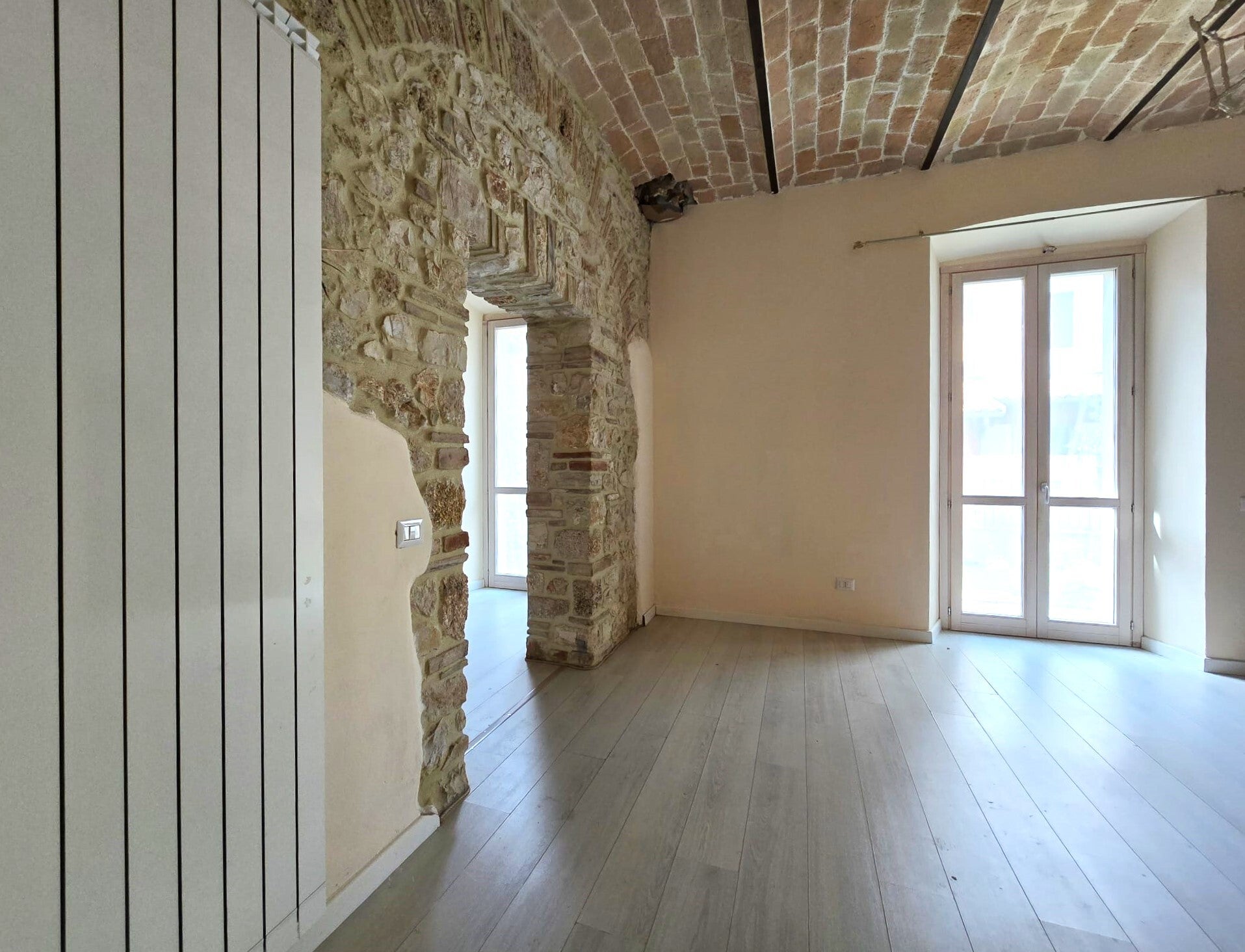 La grande bellezza dell'immobile sono gli alti soffitti a volta con mattoncini a vista un dettaglio che si sposa con le nuove porte in legno, con gli archi in pietra e in mattoncini sopra a porte e finestre.