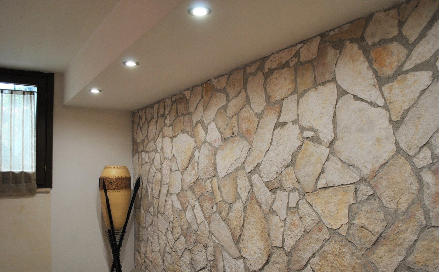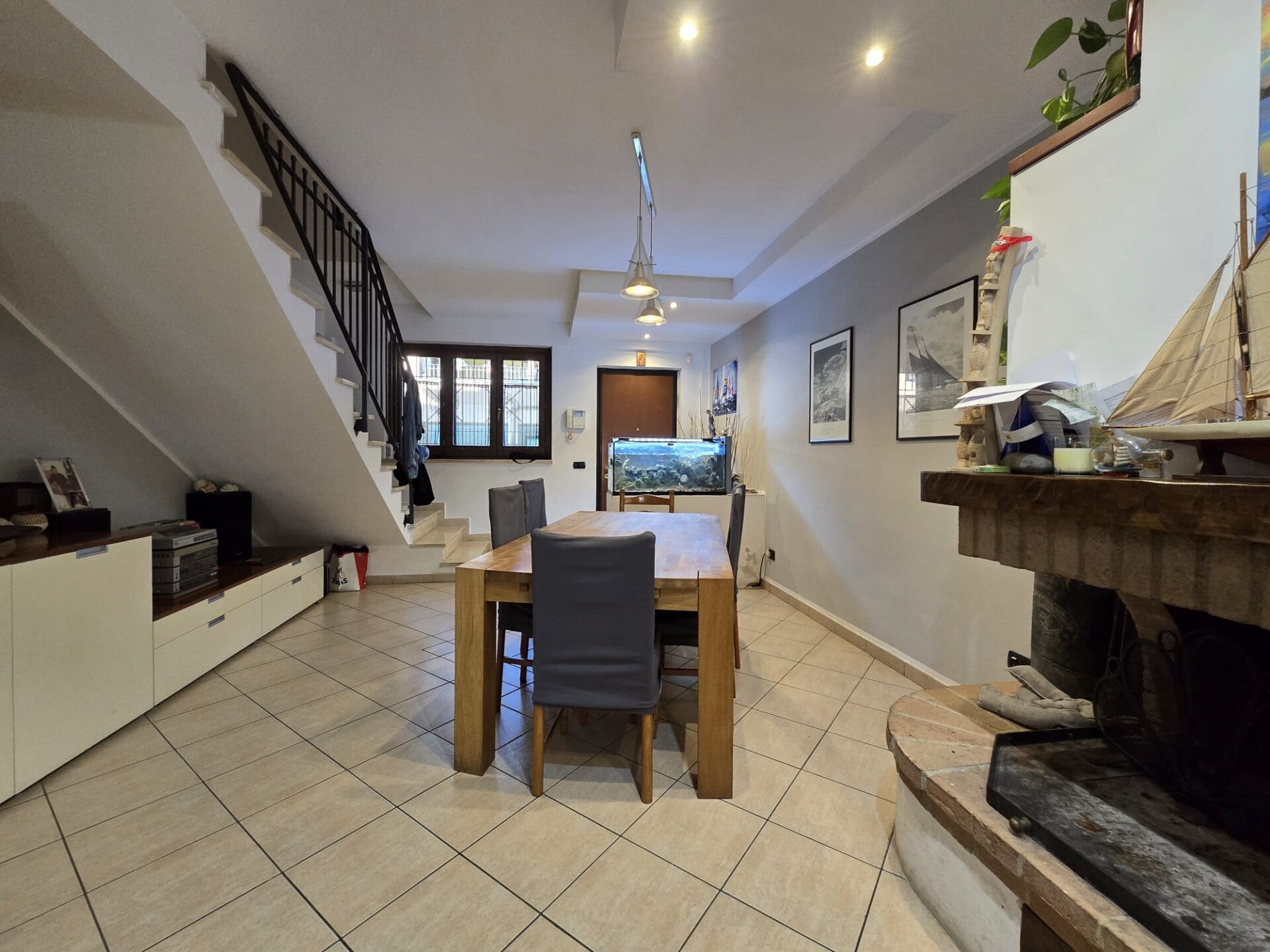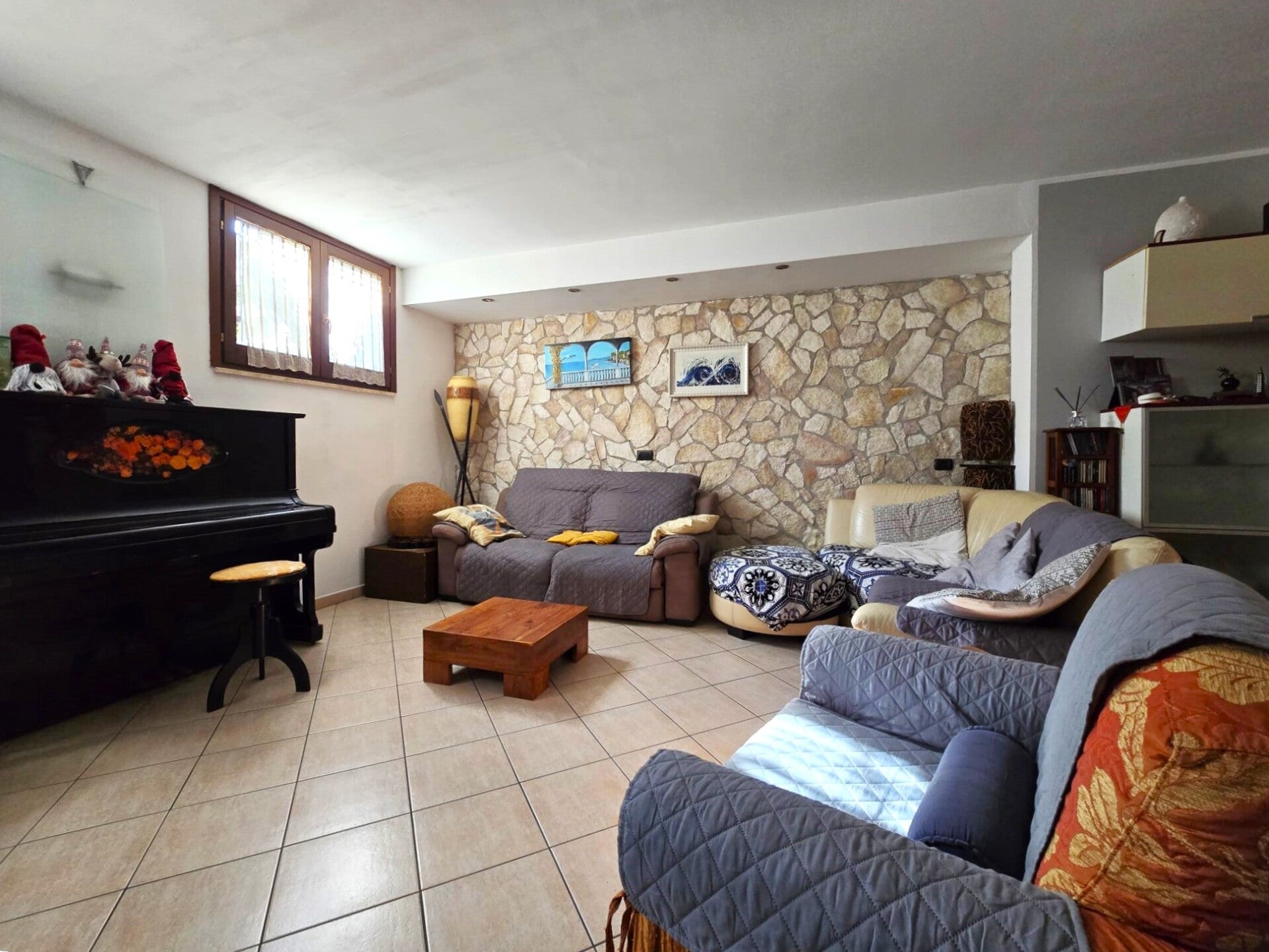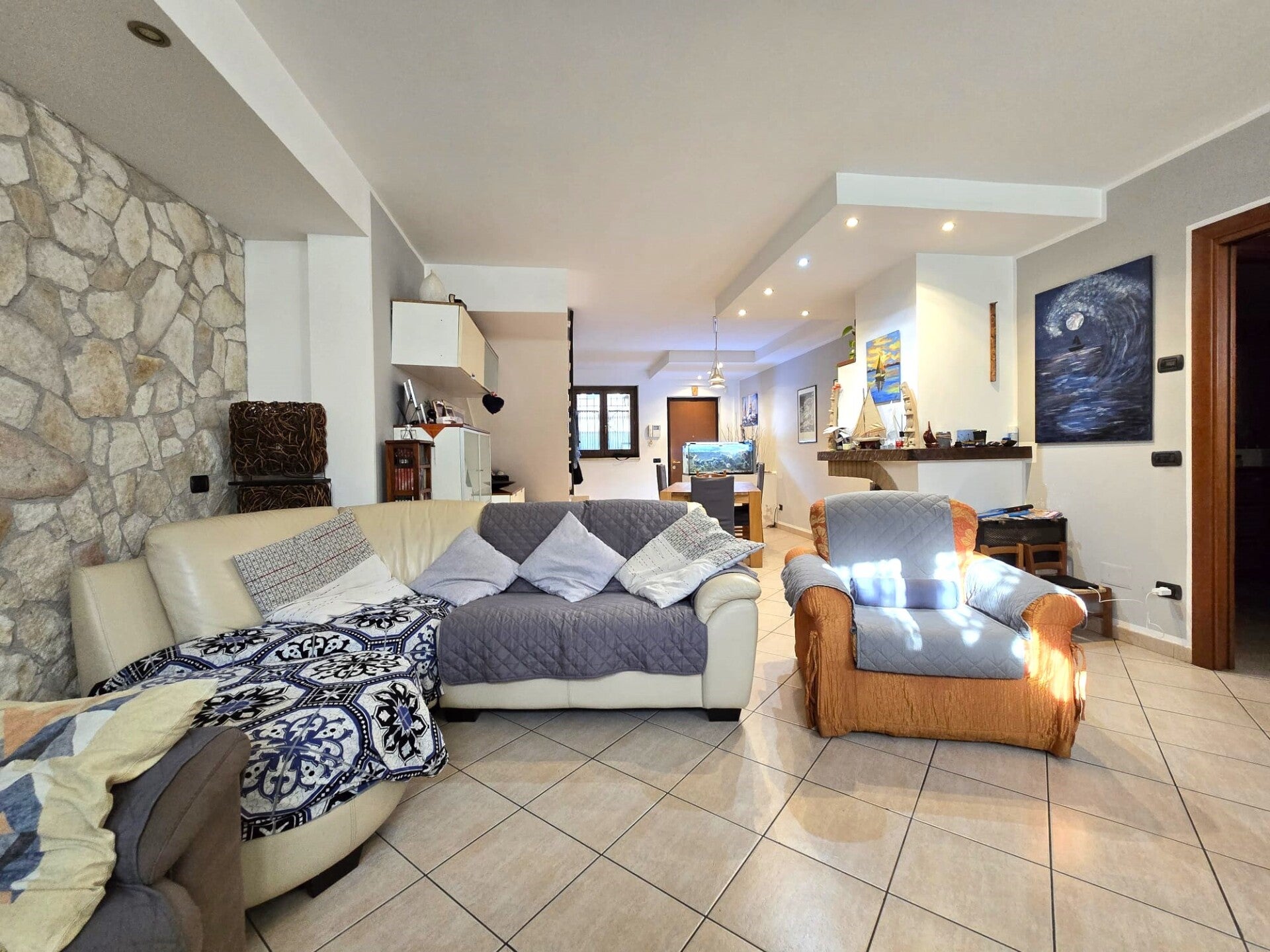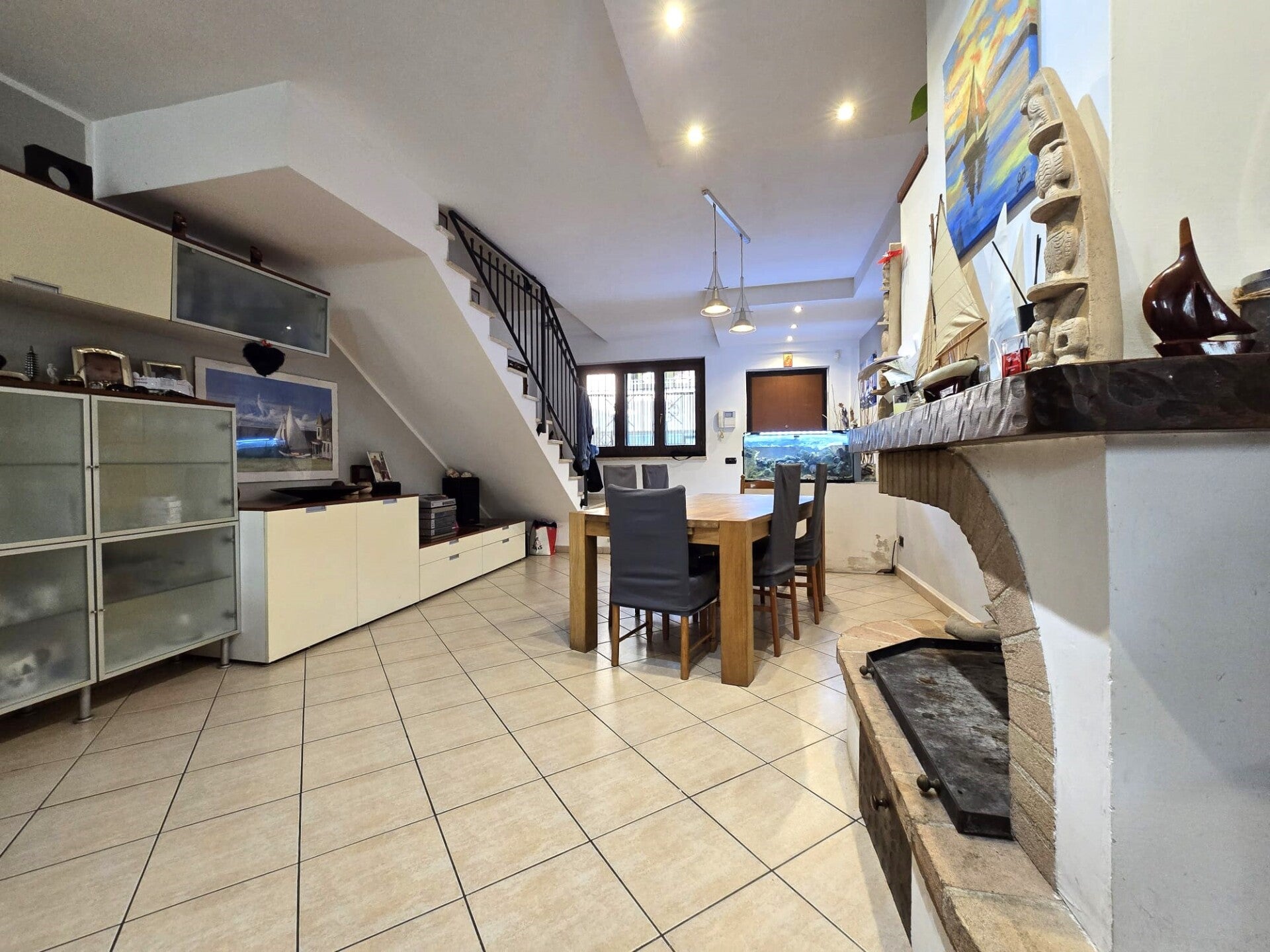 Si accede all'abitazione dal cortile pavimentato vero il portoncino di ingresso, entriamo nella zona giorno, composta da un grande salone dalla pianta rettangolare con ampia zona living e zona pranzo, arricchito da camino in muratura, una parete rivestita in pietra e un moderno controsoffitto con faretti led incastonati. La cucina è abitabile e separata dal salone. Allo stesso livello troviamo anche un pratico bagno.