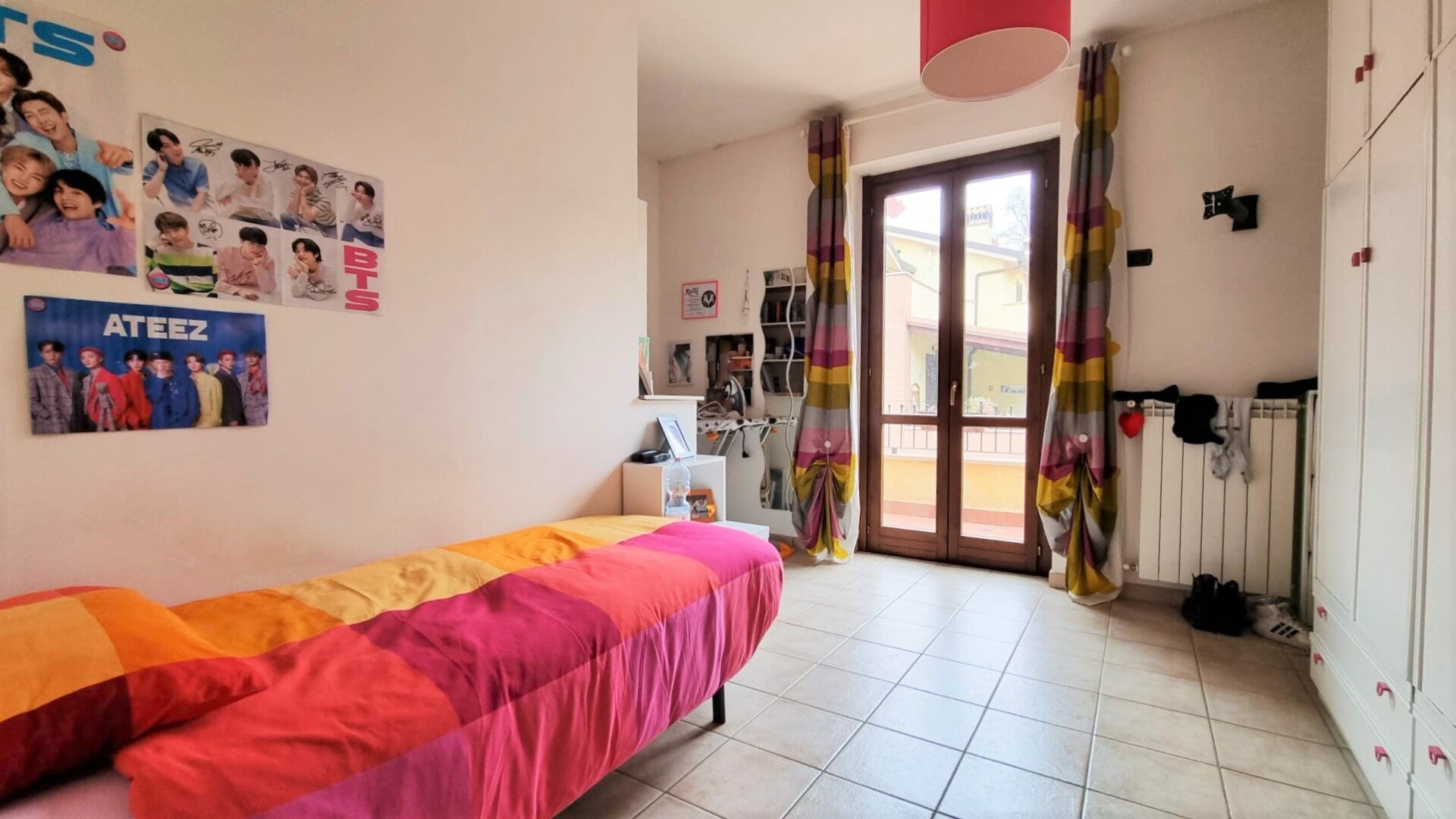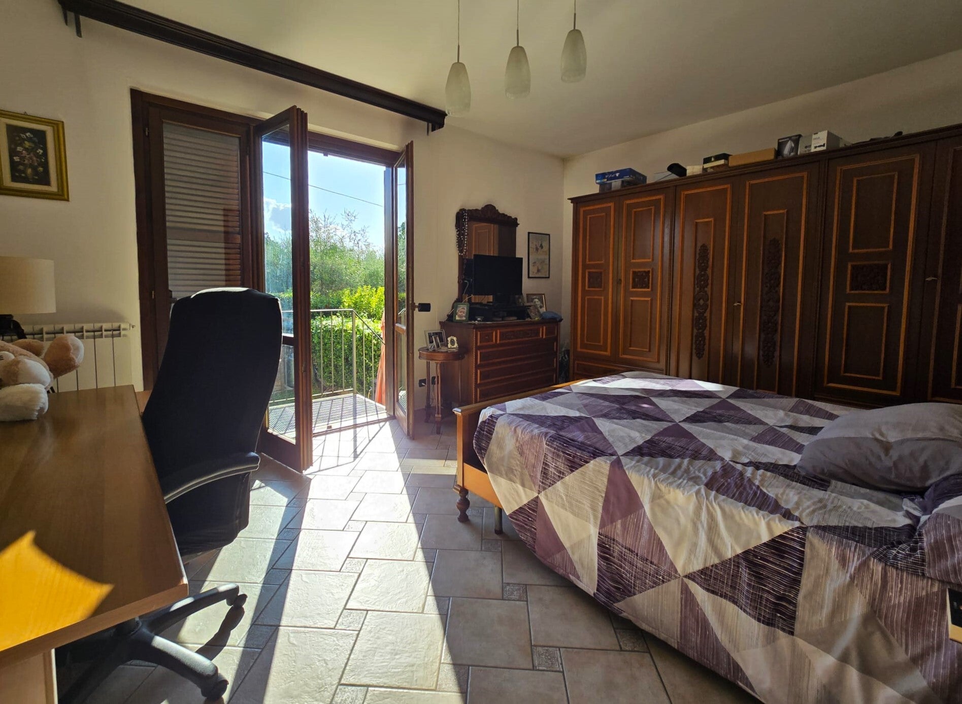 Una scala in ferro battuto e marmo conduce verso la zona notte, dove troviamo tre camere da letto e un bagno con box doccia e finestra, la camera al centro è dotata di accesso al giardino verde e recintato, con siepi per la privacy, ampio circa 160mq.
