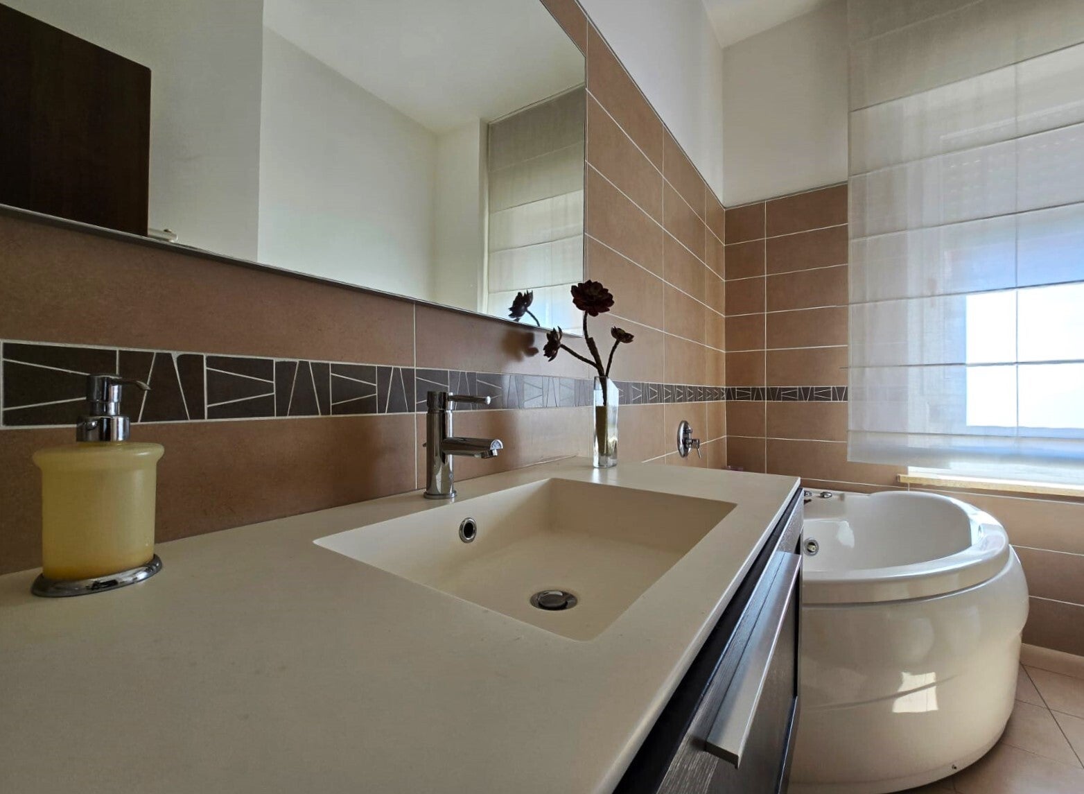 Un disimpegno con accesso da porta in legno e vetro conduce verso la zona notte dove ci sono due camere da letto spaziose, un bagno di servizio con doccia e il bagno principale con finestra e vasca idromassaggio angolare.