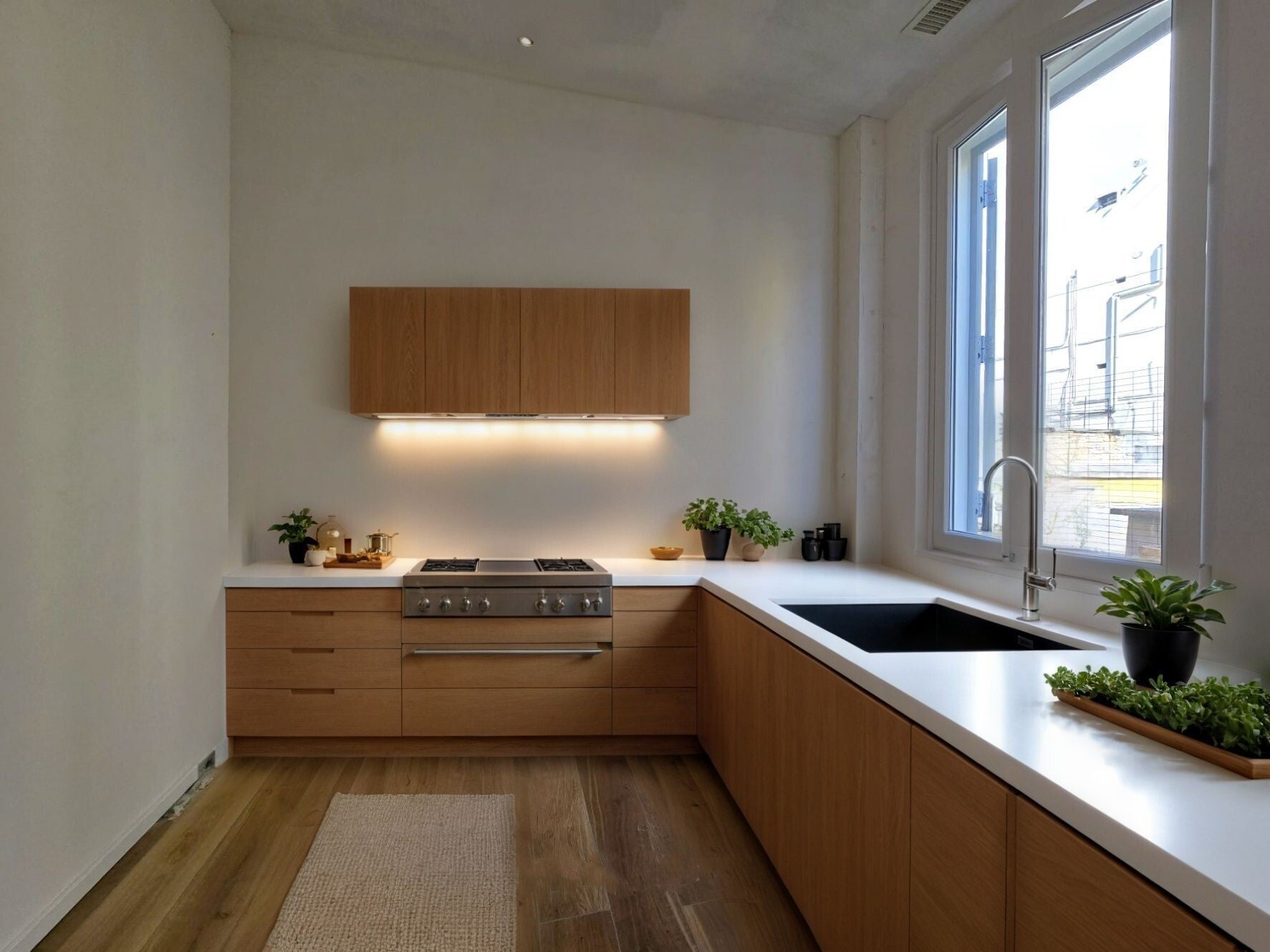 La cucina semi abitabile è nascosta da un fondello e una porta a scrigno, anch’essa ricca di luce grazie all’ampia finestra.
