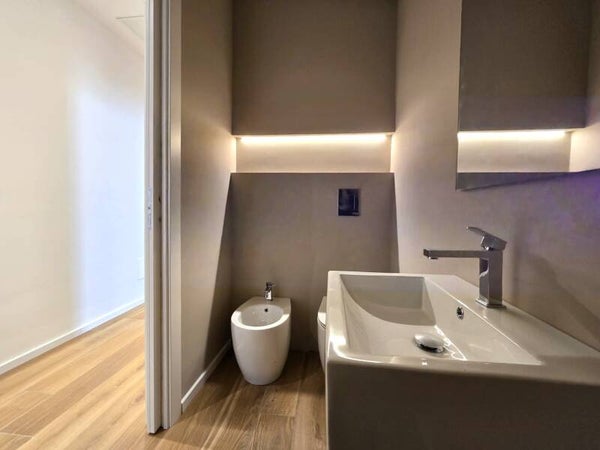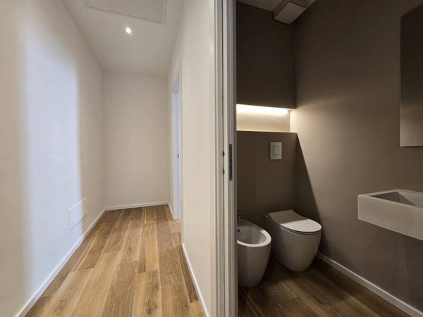 Un disimpegno conduce verso l’elegante bagno degli ospiti con delicati e studiati giochi di luce incastonati nel cartongesso.
