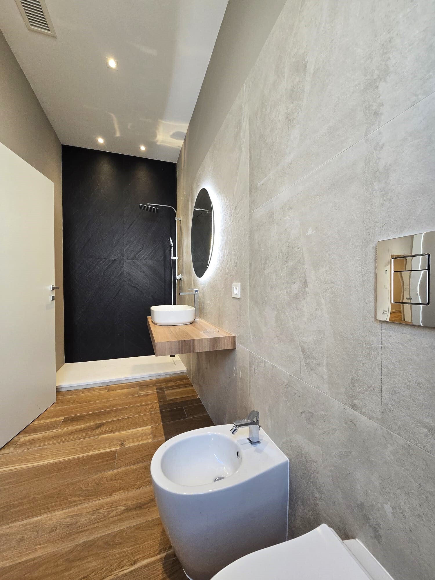 Importanti i materiali utilizzati come i pavimenti in grès effetto legno, i rivestimenti dei bagni e della doccia, i lavabi dal taglio moderno … tutto accuratamente selezionato.