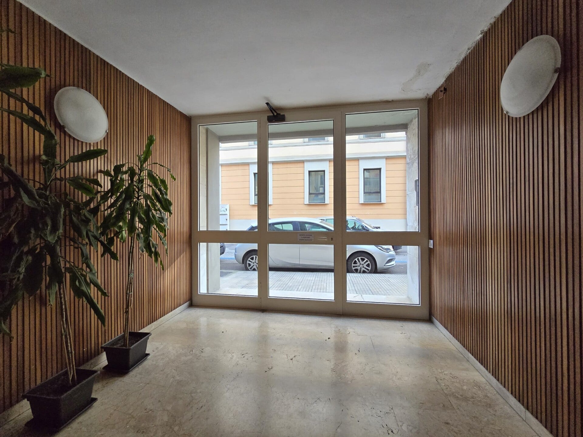 L'appartamento si apra su un grande ingresso di rappresentanza che divide i vari ambienti della casa; sulla sinistra troviamo la cucina abitabile dotata di un’ampia dispensa e di uscita sul balcone con affaccio verso un cortile interno con alberi ad alto fusto, sulla destra invece si trova l'ampio salone con 4 finestre.