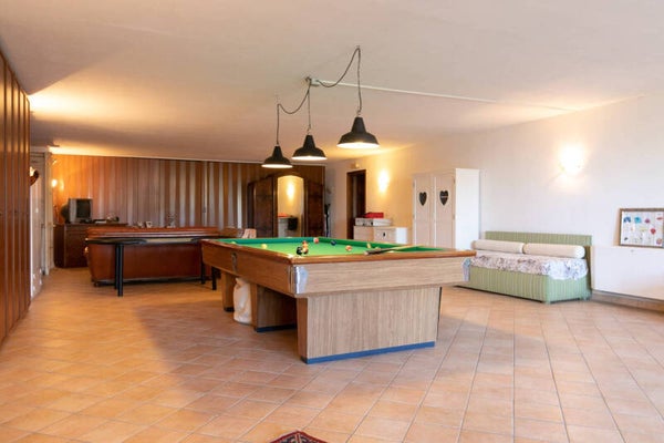 La proprietà continua con la dépendance, ideale per gli ospiti o per il personale di servizio, è costituita da una zona giorno con cucina a vista, una camera matrimoniale e il bagno. Di fianco abbiamo una spaziosa zona hobby, circa 250mq perfetta per feste al coperto anche nelle stagioni invernali, per rilassarsi e giocare, un luogo che i bambini e i ragazzi ameranno.
