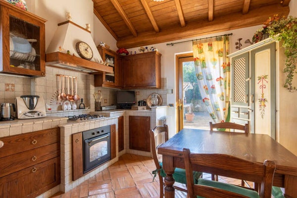 Completa la proprietà la piscina, il campo sportivo da tennis e da calcio, la rimessa per le auto e il forno esterno.