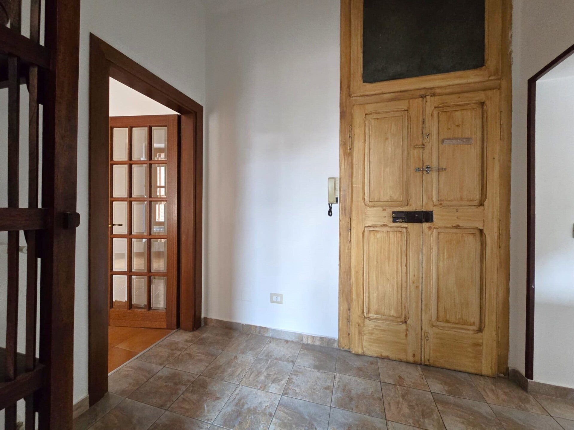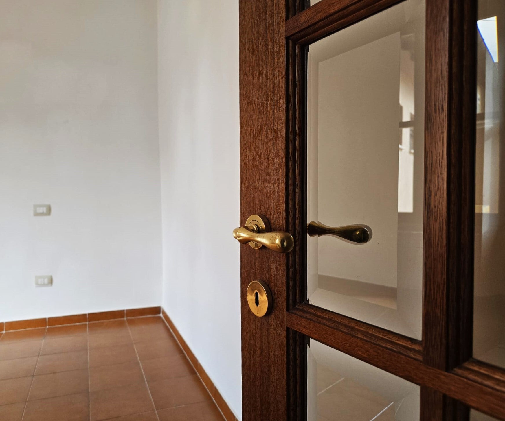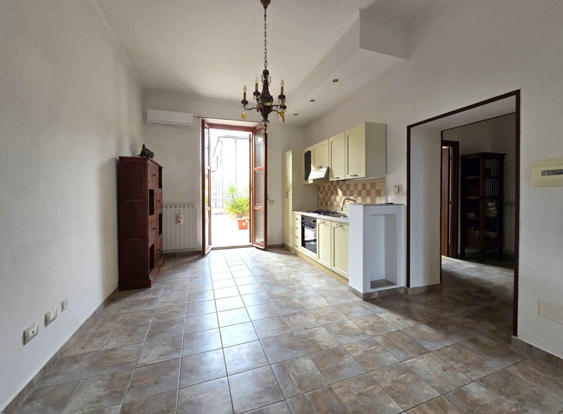 Entriamo della casa e ci accoglie un disimpegno che conduce verso la zona giorno open space, con angolo cottura a vista e porta finestra verso il terrazzo abitabile.